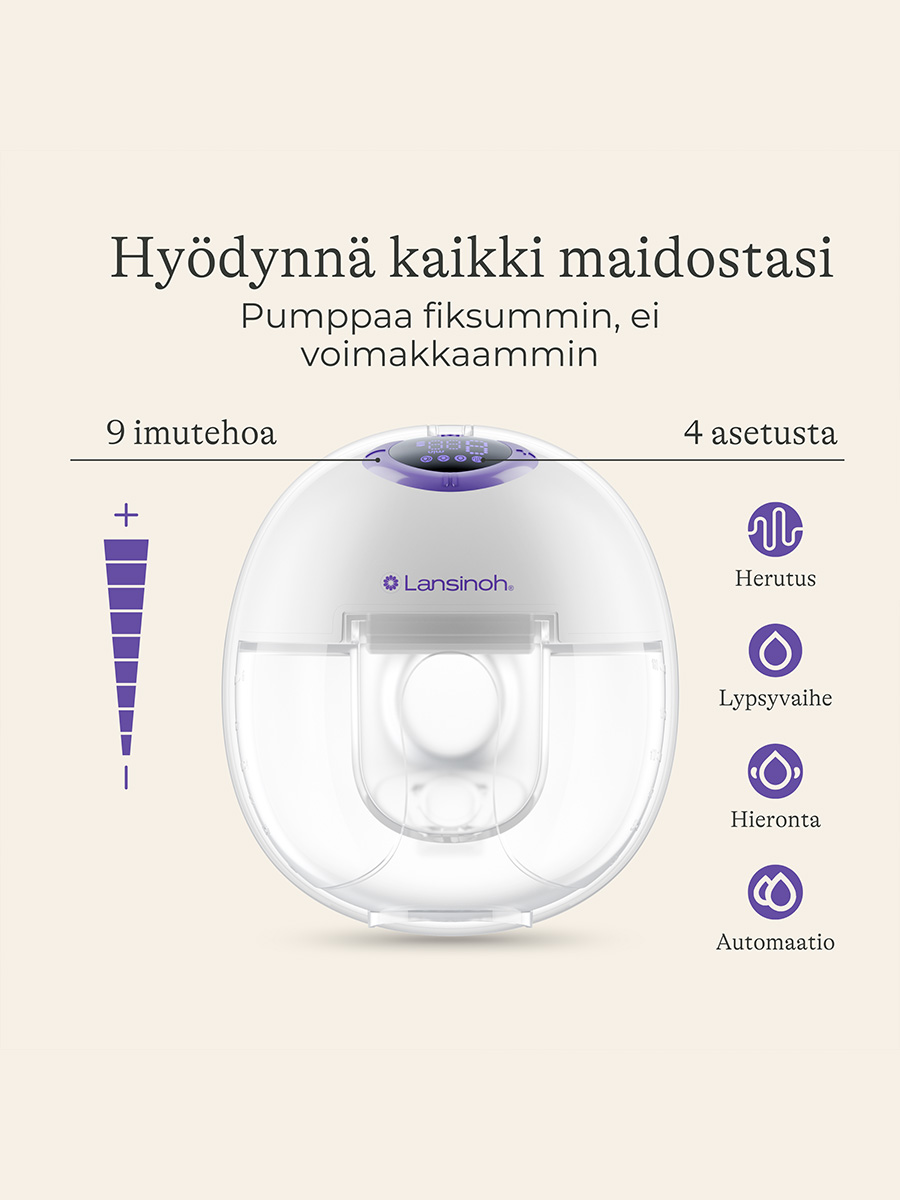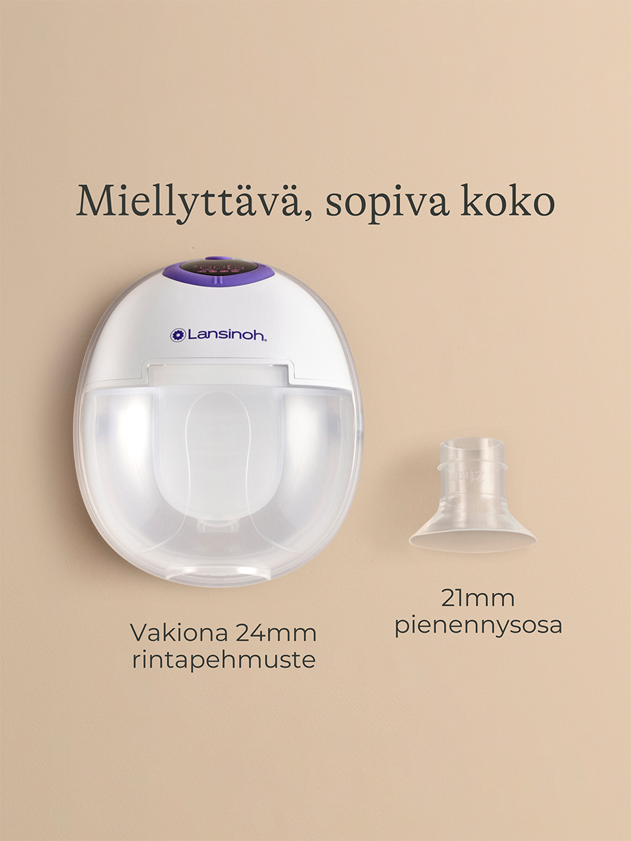 Wearable Pump Double rintapumppu on täysin hands-free: Lansinohin Wearable Pump sujahtaa huomaamattomasti rintaliiveihisi ilman letkuja tai johtoja, mahdollistaen pumppauksen missä tahansa ilman kompromisseja sairaalatason imutehosta. Erittäin hiljainen ja kevyt, 1,5 tunnin akunkestolla, tarjoaa todellisen hands-free-pumppauskokemuksen. Lisäksi vain neljä osaa puhdistettavana – aikaa jää enemmän sinulle.