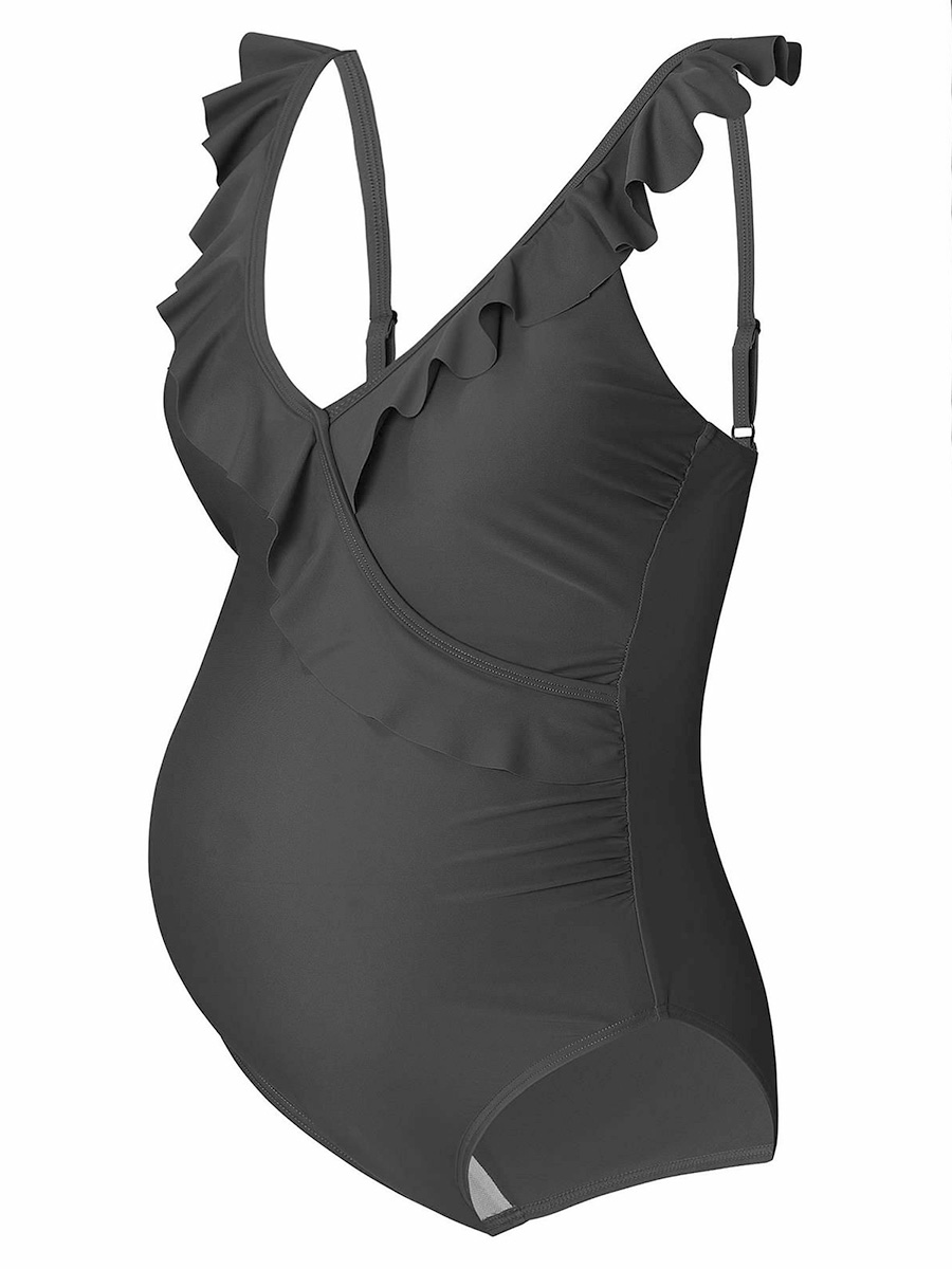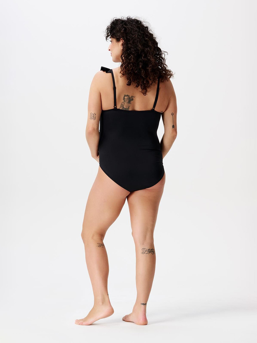 Äitiysuimapuku Sima Black romanttisilla frillikoristelluilla olkaimilla. Uimapuku suojaa auringon UV-säteiltä ja istuu mukavasti koko raskauden ajan.