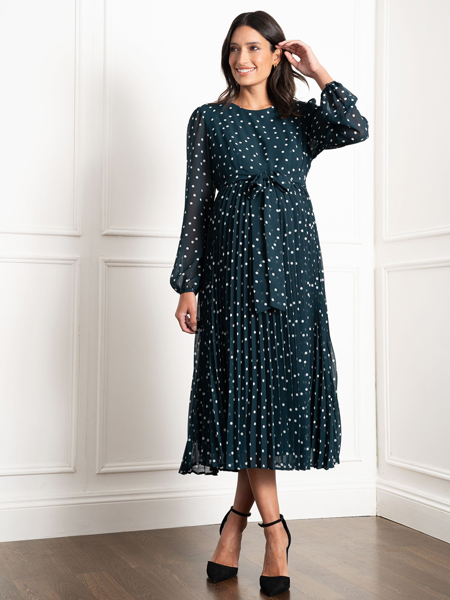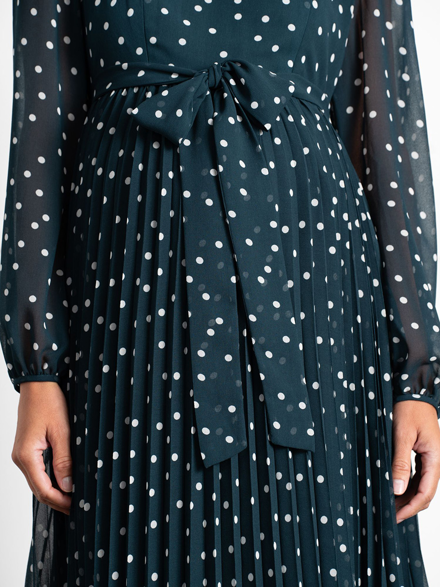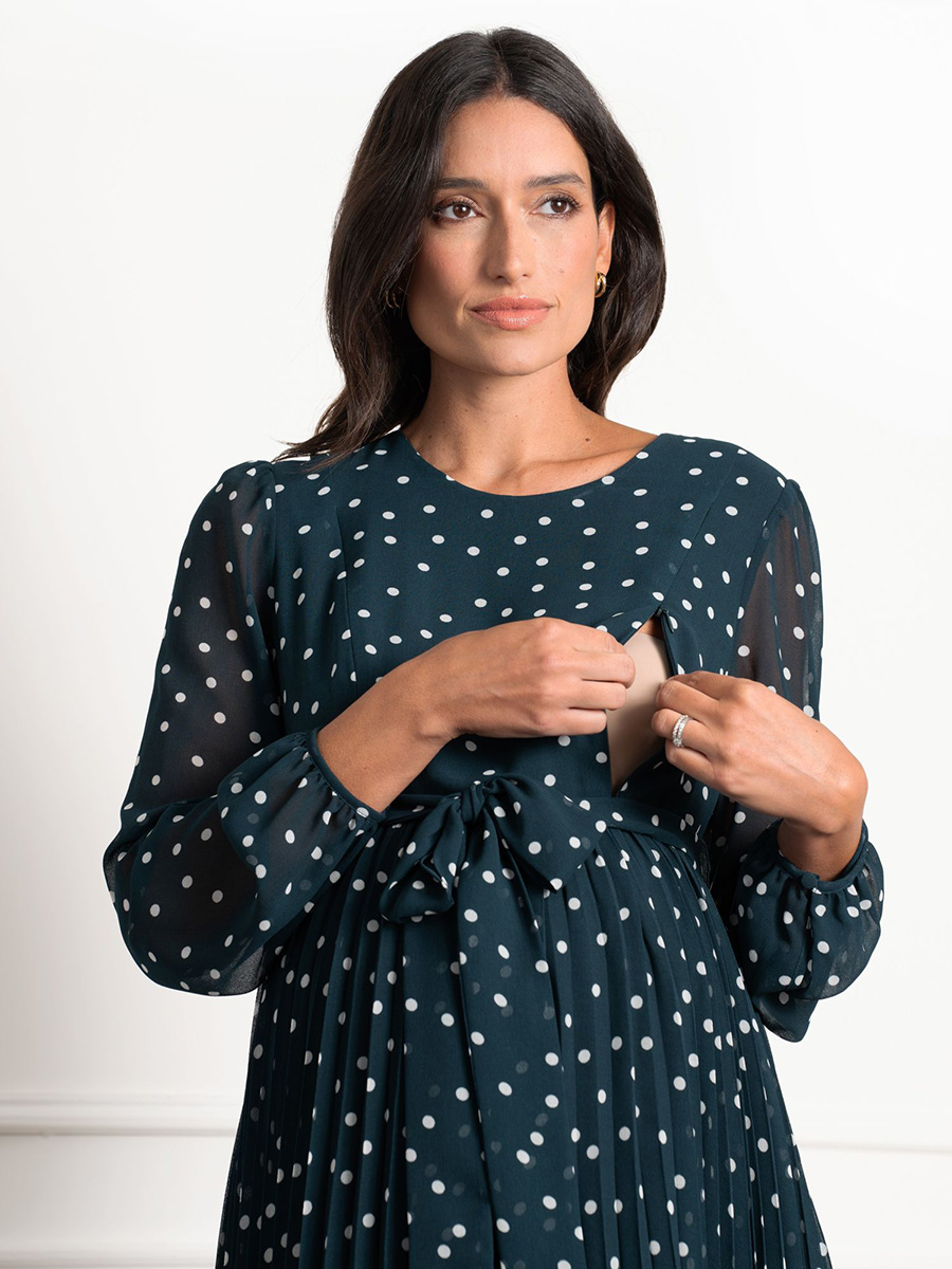 Imetysmekko Adelaide Emerald on juhlallinen ja elegantti mekko, jonka kuosina ovat klassisen valkoiset polkapilkut emeraldin vihreällä pohjalla. Tässä sekä äitiysajalle että imetykseen sopivassa mekossa on piilotetut vetoketjut imettämistä varten sekä näyttävä vyö rusetilla.