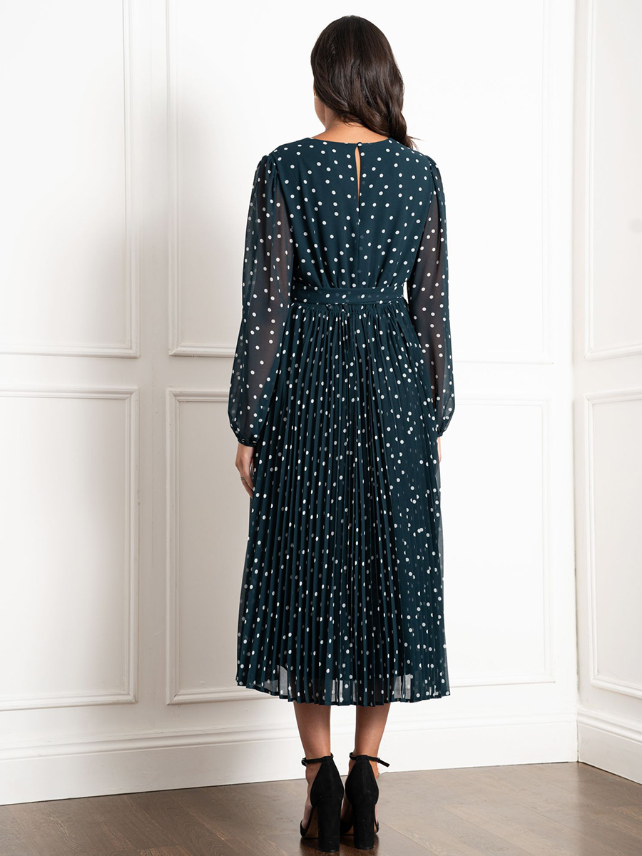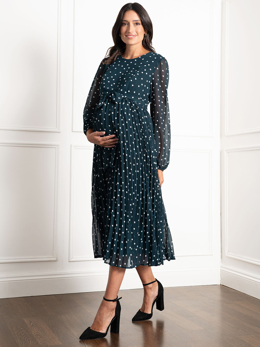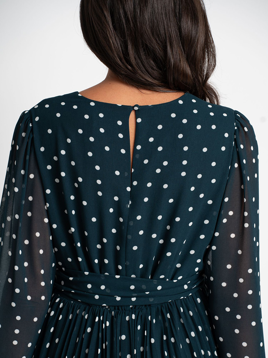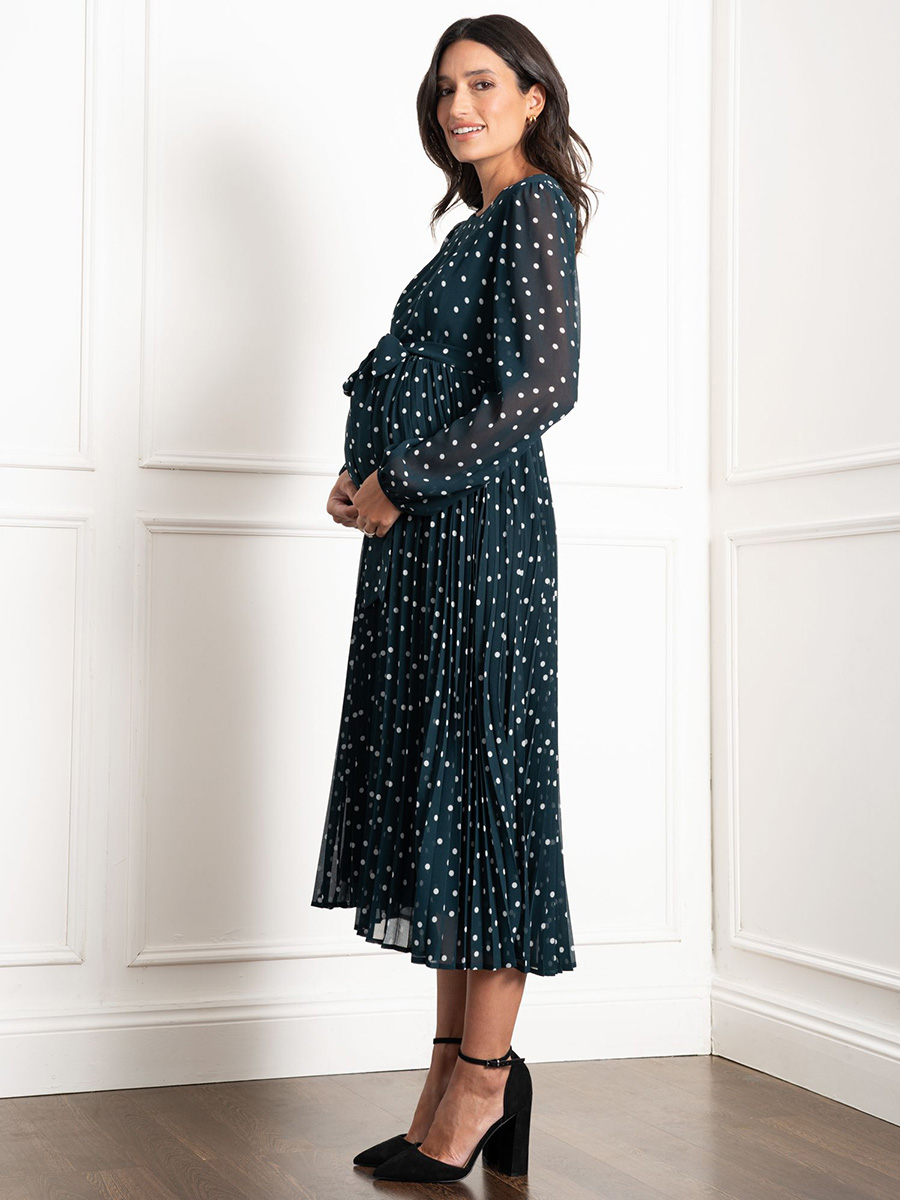 Imetysmekko Adelaide Emerald on juhlallinen ja elegantti mekko, jonka kuosina ovat klassisen valkoiset polkapilkut emeraldin vihreällä pohjalla. Tässä sekä äitiysajalle että imetykseen sopivassa mekossa on piilotetut vetoketjut imettämistä varten sekä näyttävä vyö rusetilla.