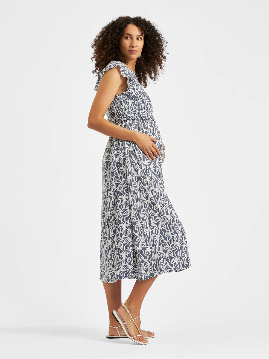 Imetysmekko Edie Nursing Dress Washed Indigo yhdistää mukavuuden ja eleganssin. Tässä yhdistetyssä äitiys-imetysmekossa on jousto-ommeltu yläosa, hellästi rypytetty helma sekä pyöreä pääntie. Olkapäillä on lyhyet frillihihat.