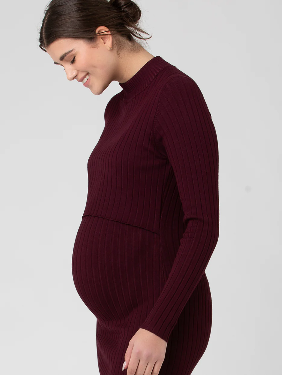 Imetysmekko Nella Rib Maroon on pehmeää, joustavaa ribbineulosta, joka mukailee kehoa ja joustaa kauniisti vatsan kasvaessa. Vauvan synnyttyä imetys onnistuu helposti raottamalla etuosan kaksoiskangasta.