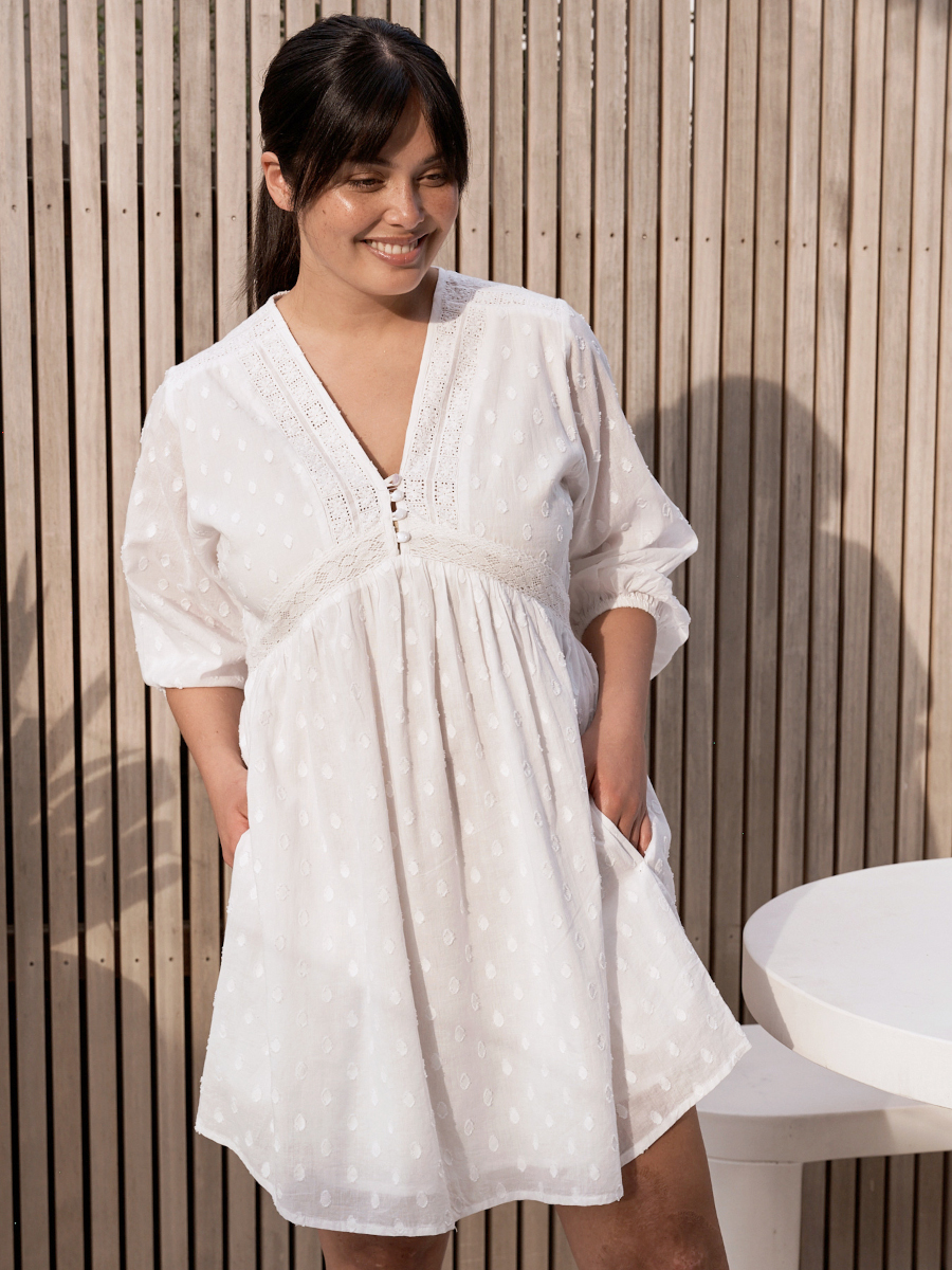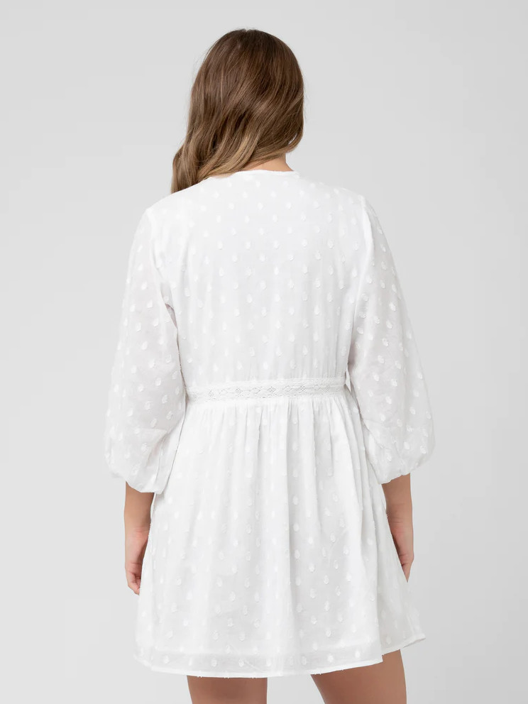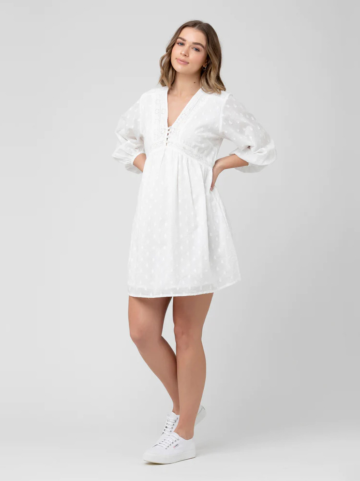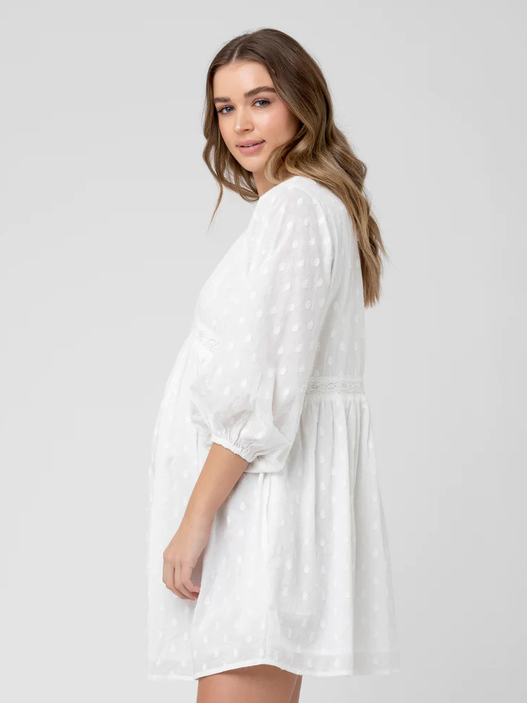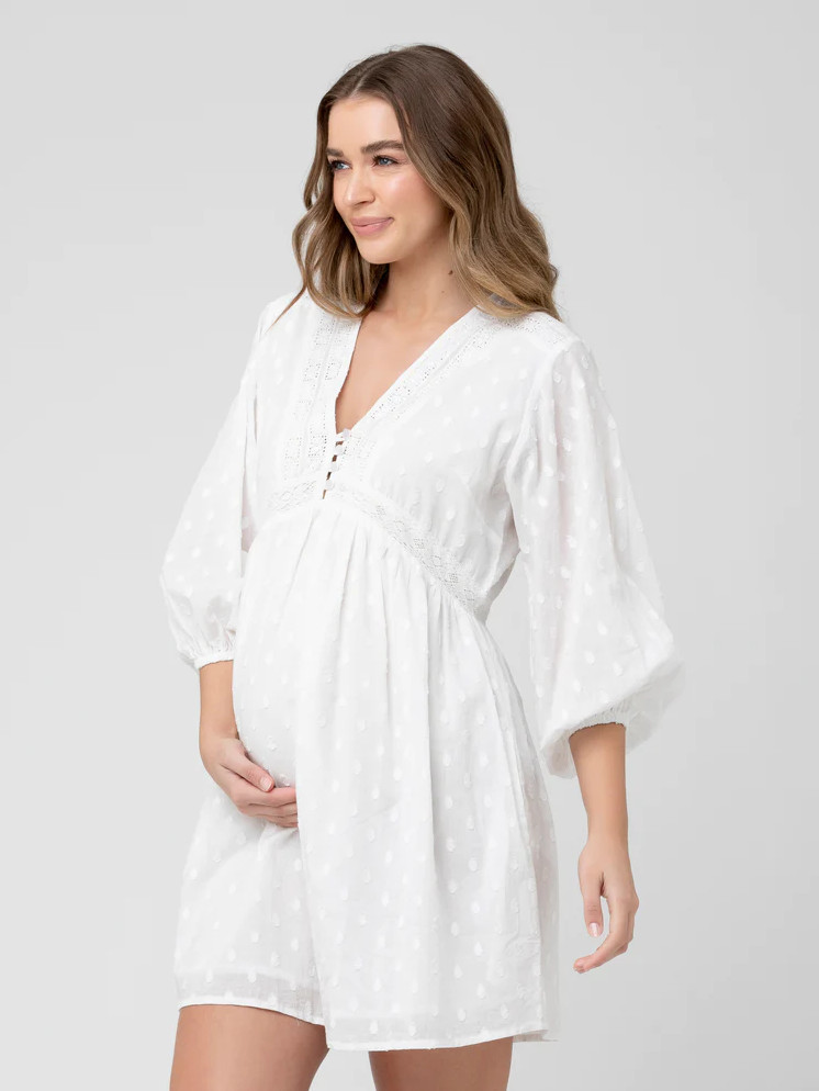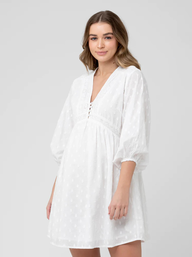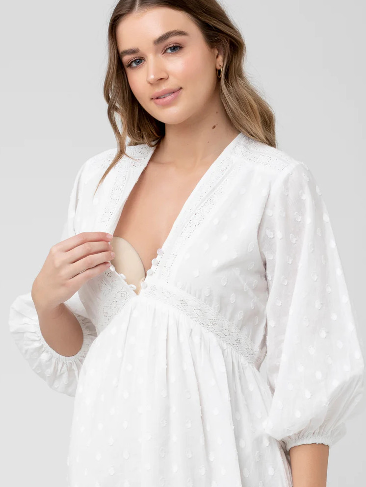 Imetysmekko Valentina tuo tuulahduksen boheemia kesätunnelmaa. Pehmeästä puuvillasta valmistettu mekko on romanttisesti kauttaaltaan kirjailtu. V-mallista pääntietä koristaa kolme nappia ja näyttävät, kyynärpituiset pussihihat kruunaavat asun.