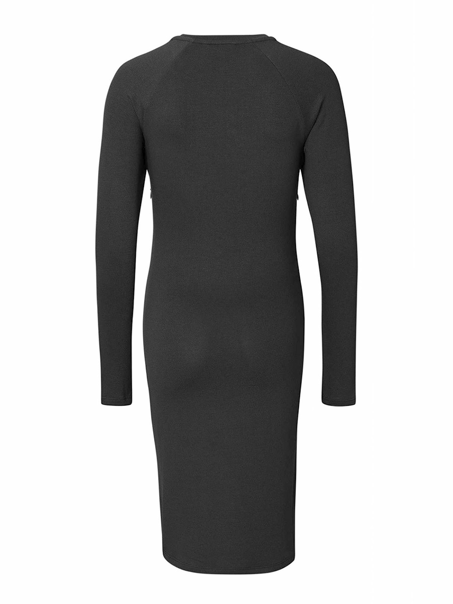 Mekossa on pitkät hihat, polvien alapuolelle ulottuva helma sekä pyöreä pääntie. Tyköistuva mekko imartelee vartalon muotoja, joustaa ja on ihanan mukava myös raskaudesta palautumisen aikana.