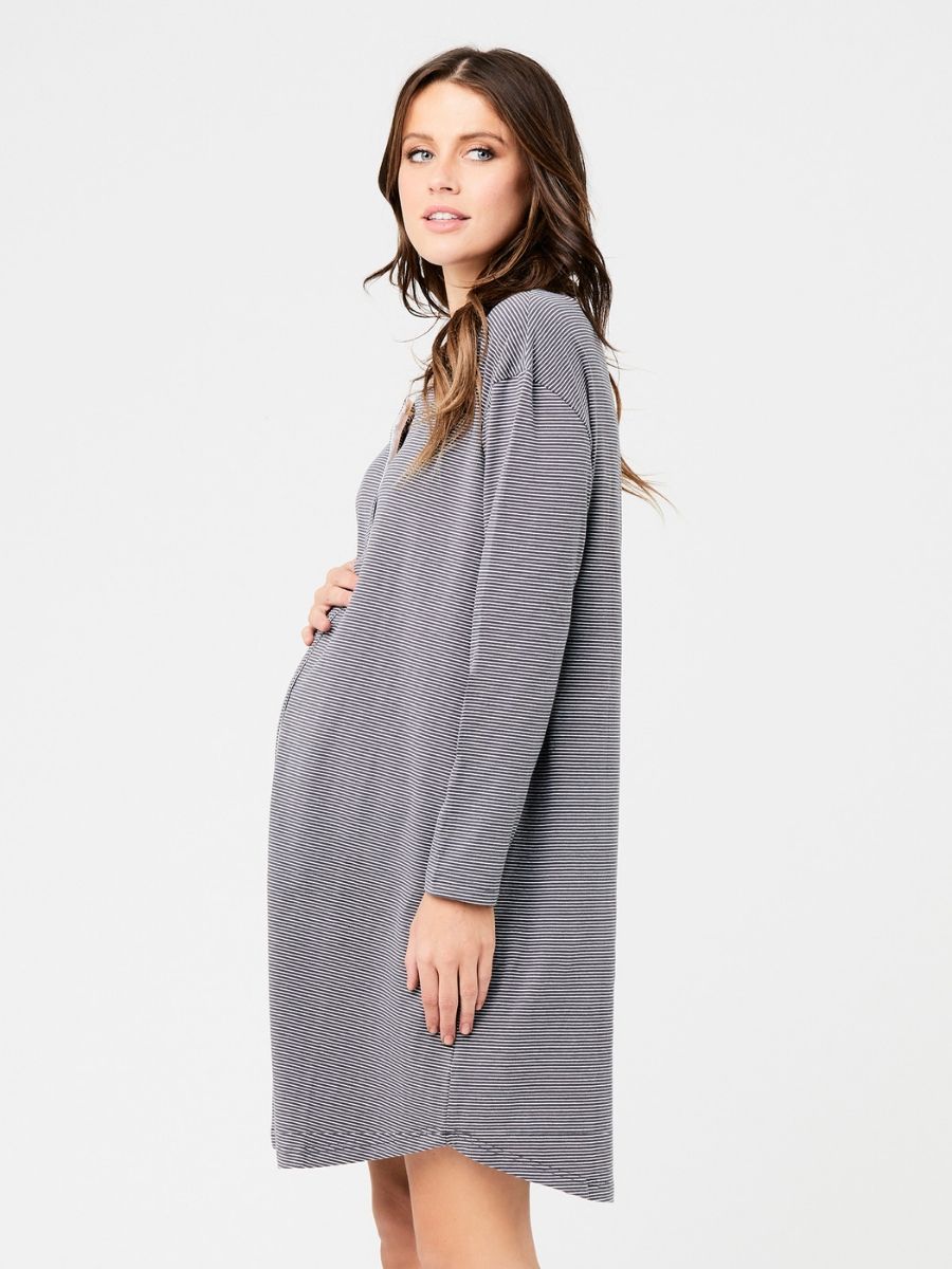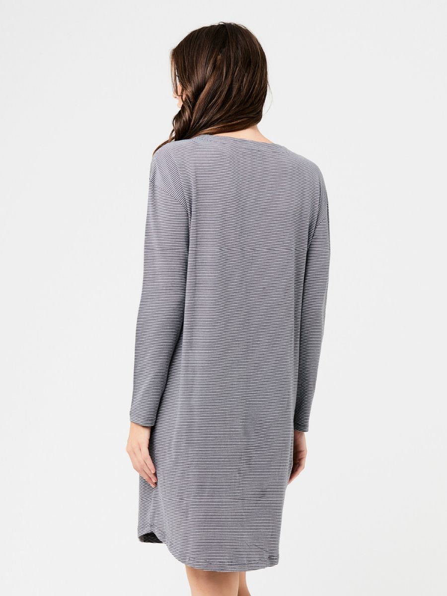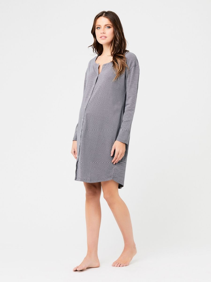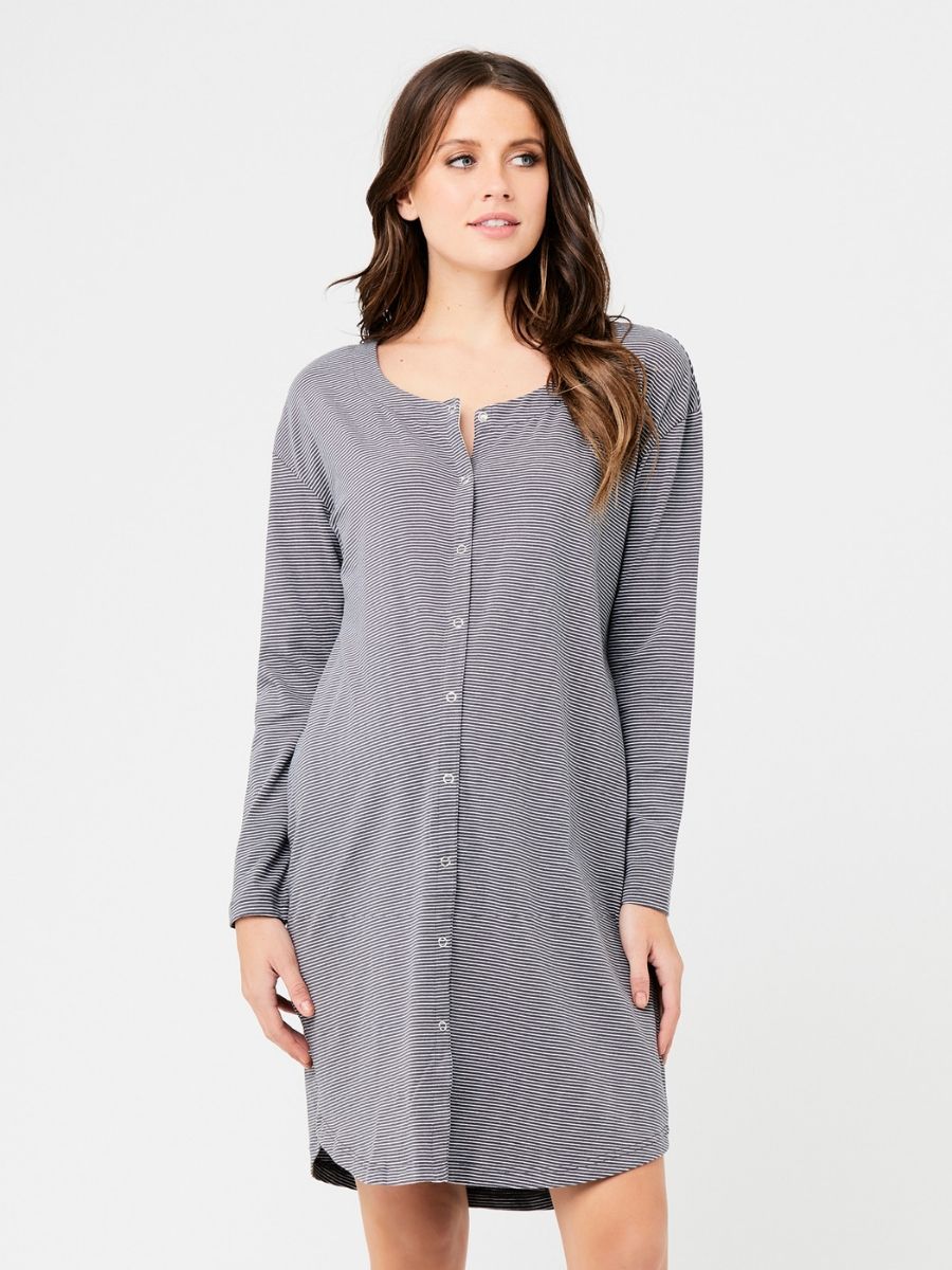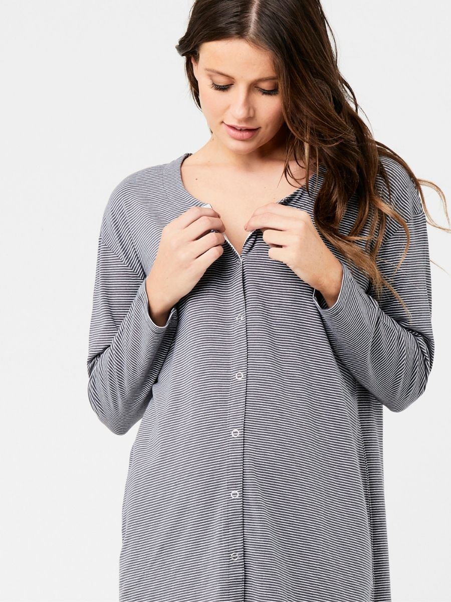 Yöpaita Blake Button Up on ihanan pehmeä, raidallinen puuvillayöpaita, jonka napitus koko pituudelta tekee yöllisestä imettämisestä helppoa. Väljän joustavan mallin ansiosta paita on hyvä jo odotusaikana ja myös vauva on helppo ottaa ihokontaktiin paidan sisään.