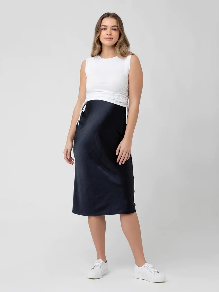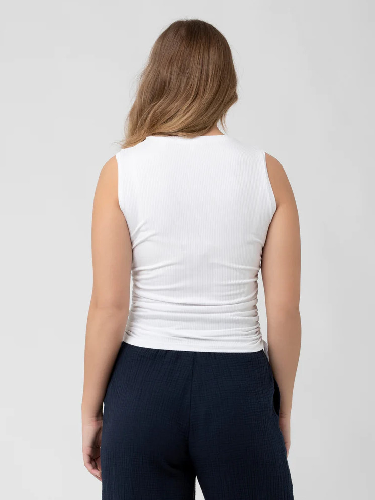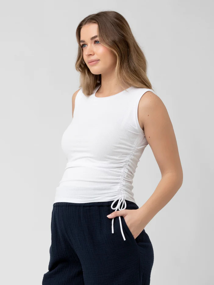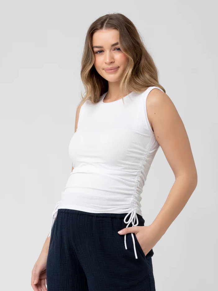 Äitiystoppi Jodie Rushed Rib on joustava, tyköistuva toppi äitiysajallesi sekä sen jälkeen. Toppi mukautuu mainiosti kehon muuttuvaan kokoon, sillä sen sivuilla on kiristettävät nyörit, joilla voi tuoda toppiin lisää tilaa tai kiristää sitä pienemmäksi.