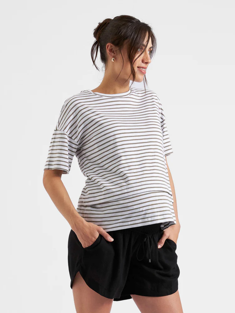 Imetys t-paita raidallinen Claudette White / Olive on rento oversized t-paita laatikkomaisella leikkauksella. Raidallinen kuosi henkii raikasta merellisyttä ja on helppo yhdistä minkä vain alaosan kanssa!