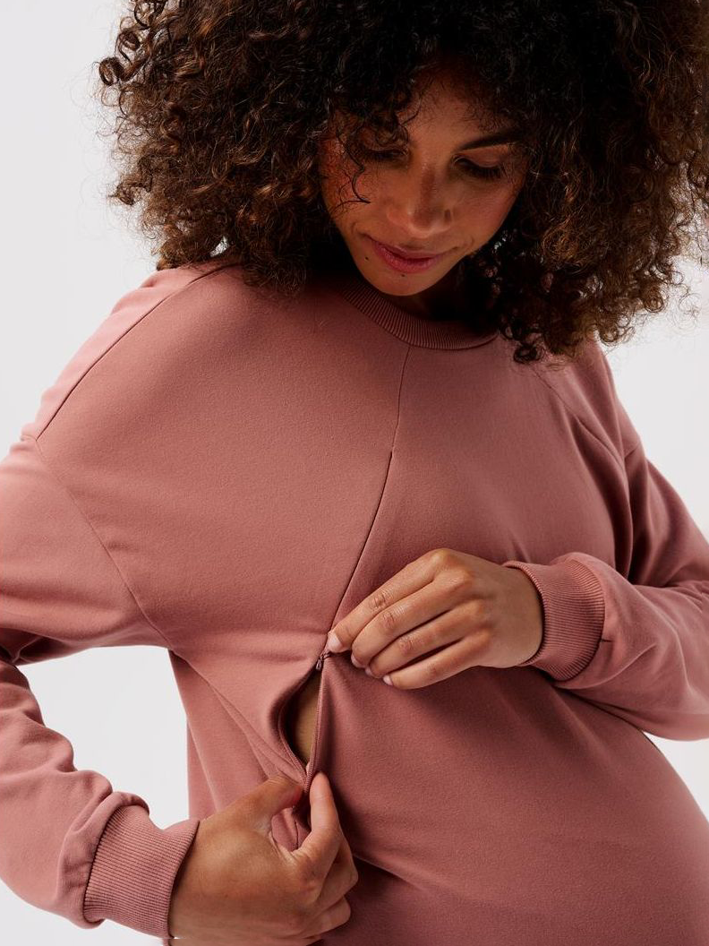 Imetyspaita Lesy Nursing Sweater Burlwood on sporttisen tyylikäs, mutta sisältä ihanan pehmoinen svetari. Pitkä malli sopii mainiosti raskausajalle ja lämmittää myös lantiota. Vauvan synnyttyä imetys onnistuu huomaamattoman vaivattomasti yläosan sivuilla olevien vetoketjujen ansiosta.
