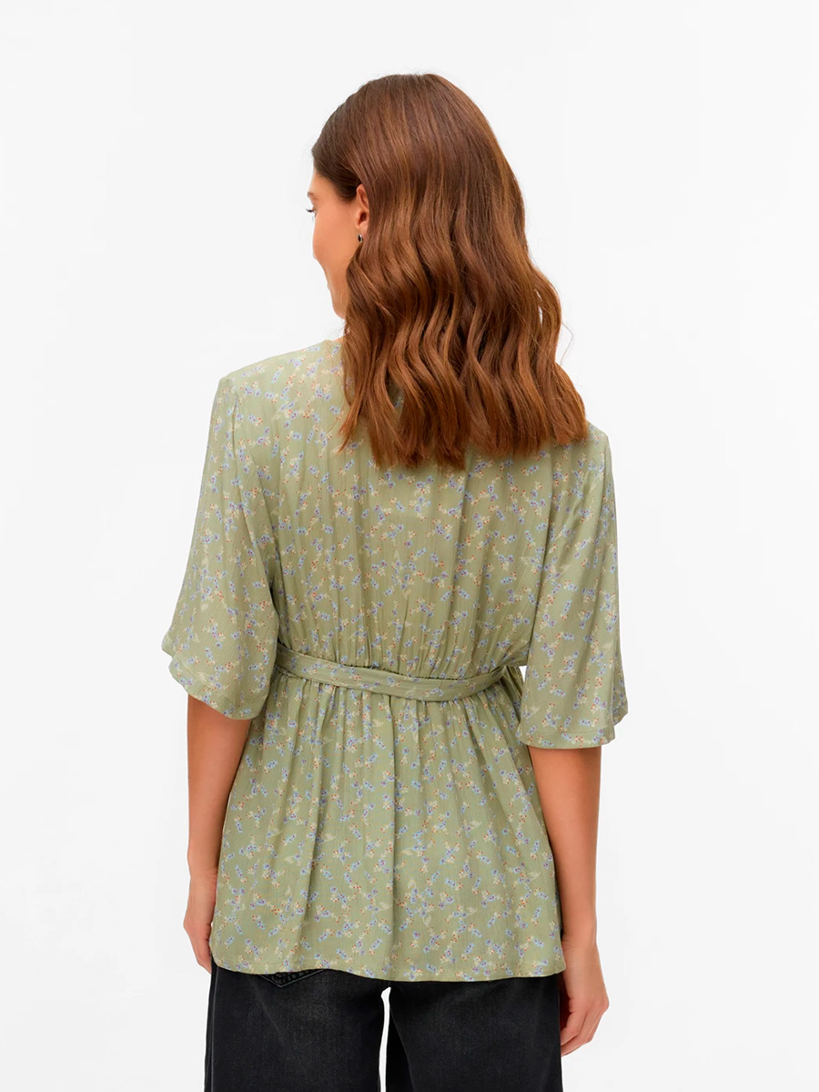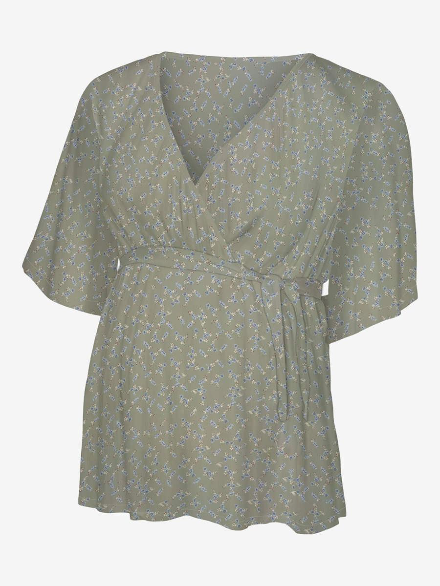 Mamalicious Imetysmekko Patrize Tess on kesäinen laskostettu paita mintunvihreällä kukkaprintillä. Paita mukautuu istuvuudeltaan niin äitiysajalle, imetykseen kuin niiden jälkeen. Laskostettu V-mallinen pääntie on helppo raottaa imetystä varten, alla on vuorikangas tuomassa yksityisyyttä.