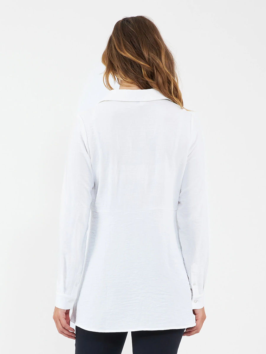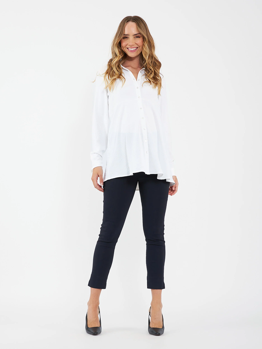 Imetyspaita Tina Peplum shirt sopii toimistolta dinnerille! Tässä valkoisessa kauluspaidassa on persoonallinen levenevä helman leikkaus, joka imertelee vartaloa niin raskauden jokaisessa vaiheessa kuin sen jälkeen.