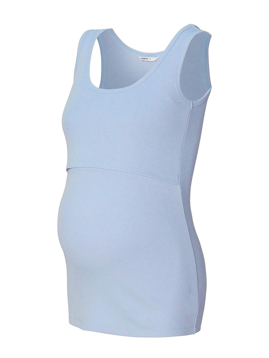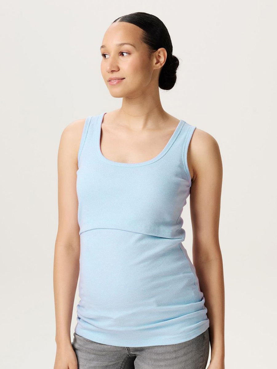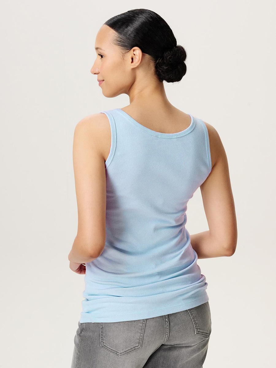 Imetystoppi Evita tanktop Light Sky on joustavaa ja mukavaa luomupuuvillaa. Ribbitoppi antaa topille kauniin tekstuurin ja palautuu muotoonsa venytyksen jälkeen. Toppi sopii niin raskausajalle kuin imetykseen.