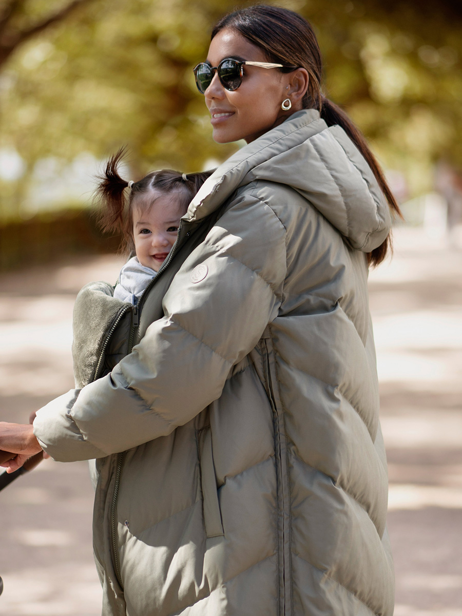 Kantotakki Adena untuvaa on muhkea, pitkä ja lämmin talvitakki untuvatäytteellä, joka mukautuu äitiystakiksi, vauvan kantotakiksi sekä tavalliseksi takiksi! Mukana tullee yksi paneeli vauvan kantamiseen ja sivuvetoketjuilla saa avattua lisää tilaa raskausvatsan kasvaessa.