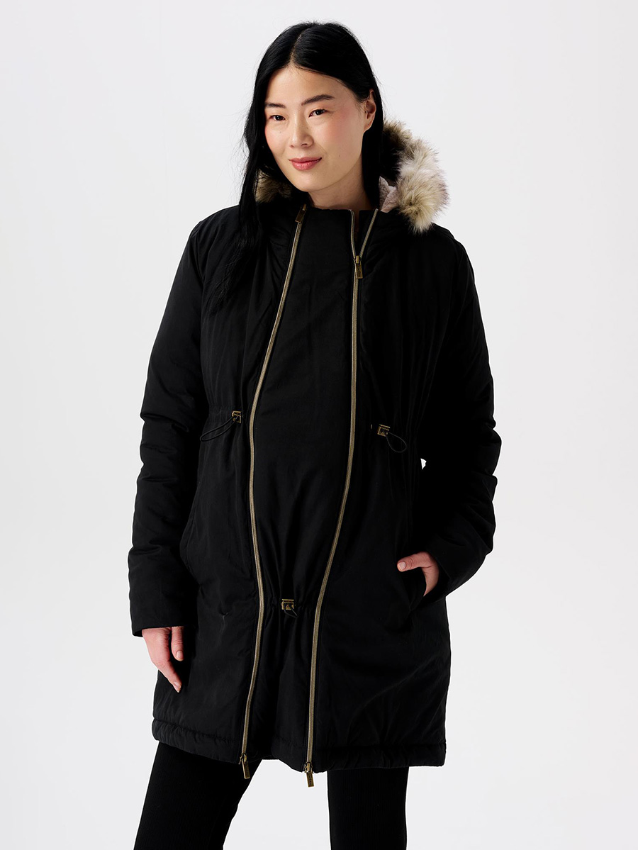 Seraphine maternityn musta, pitkä äitiys- ja kantotakki Liz tarjoaa myös aidon untuvan lämmön ja eleganssia ilmettä. Takin 3in1 ominaisuudet mukautuvat äitiystakin, kantotakin ja tavallisen takin tarpeisiin. Takin mukana tulee paneeli vauvan kantamista varten ja takin sivuilta aukeaa vetoketjulla lisätila raskausvatsan kasvaessa.