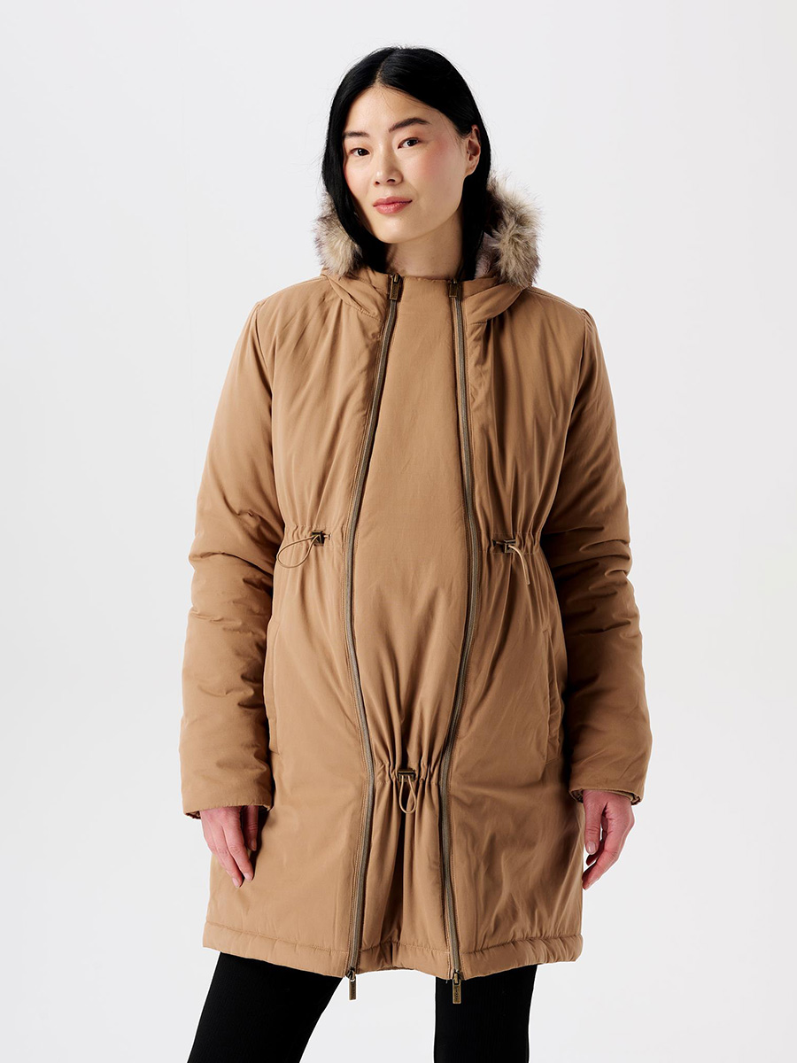 ovat olleet pitkään äitien suosikkeja! Reisiin ulottuva, pitkä äitiystakkimalli sopii niin ksupungille kuin rentoon ulkoiluun. Takki on pitkäikäinen ja mukautuu äitiystakiksi, kantotakiksi ja tavalliseksi takiksi. Vuoraus on ihanan pehmoista ja huppua koristaa karvareunus.