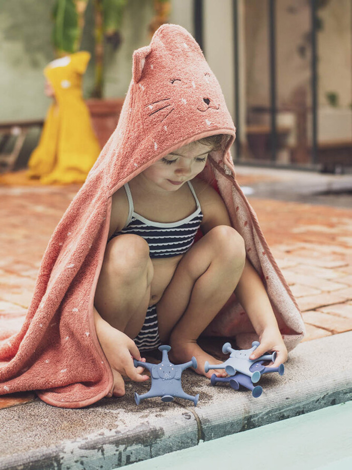 Huppupyyhe Mrs Cat on lapsille sopivan kokoinen pehmeä froteepyyhe, jossa on käytevä huppu! Hupun suloinen eläinhahmo ilahduttaa lapsia ja tekee niin kylpyhetkistä kuin rantaleikeistä hauskempia. Huppu pysyy lapsen päässä ja auttaa pyyhettä pysymään paikoillaan sekä pitämään lapsen lämpimänä.